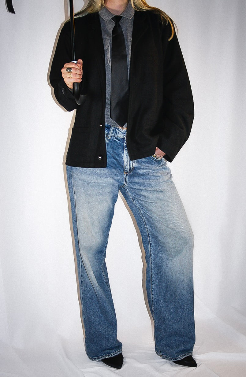 This jacket features a slightly oversized fit with a clean, structured cut. The cropped length adds a modern balance to its classic shape, offering a refined silhouette that remains versatile in styling.